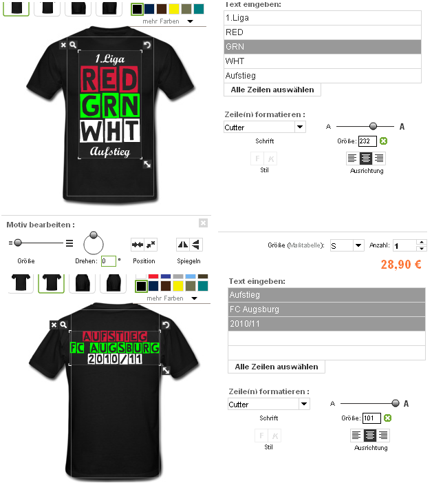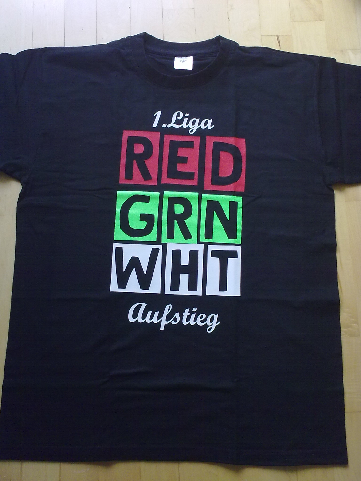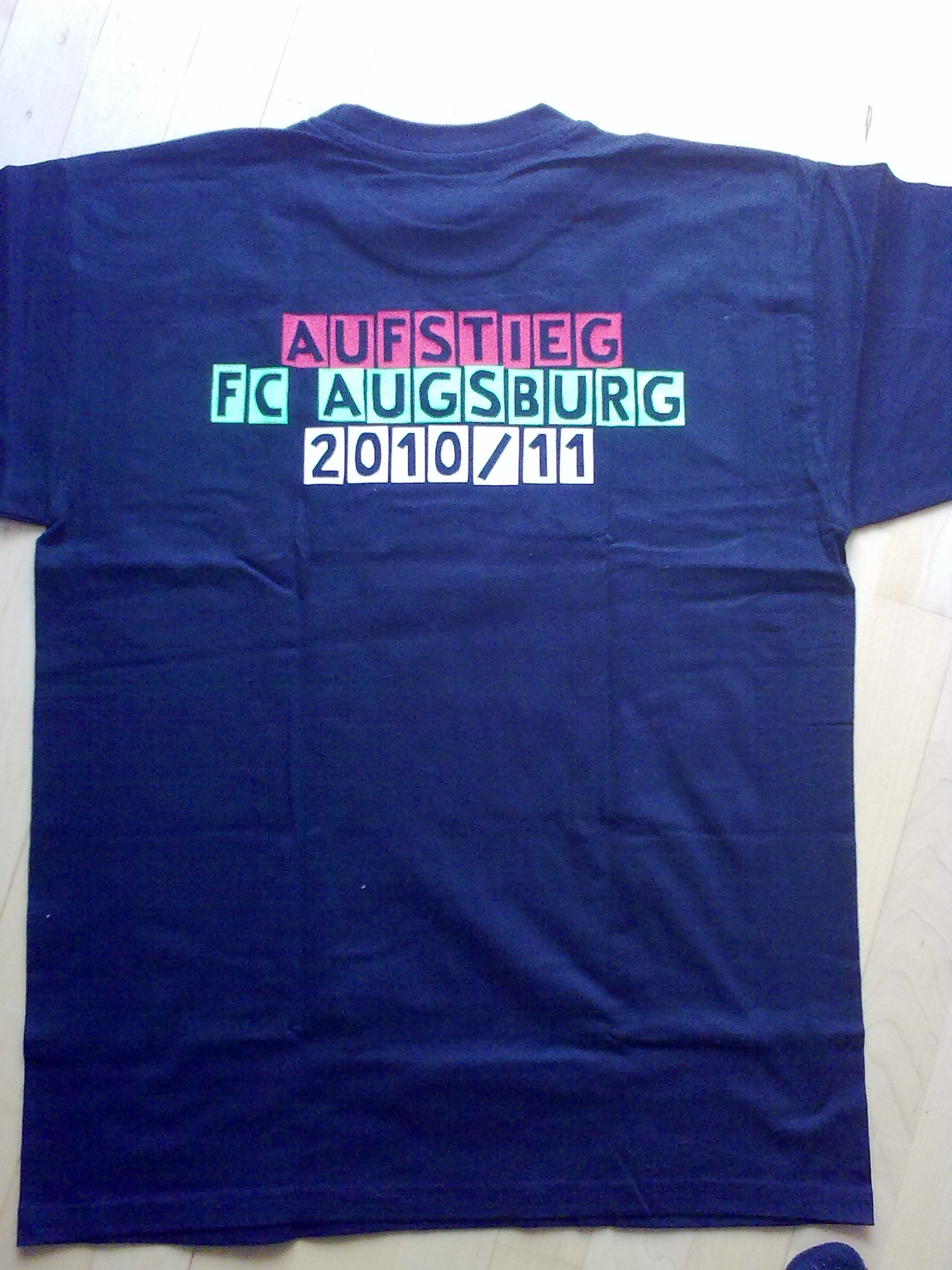 Da ich Vorsitzender eines Fanclubs des FC Augsburg bin und der Aufstieg in die 1. Fußball-Bundesliga bevorsteht, wollte ich für meinen Fanclub ein schönes Aufstiegsshirt entwerfen und schrieb aus diesem Grund die Leute von www.shirt-selbst-bedrucken.de an. Nach einer sehr erfreulichen Rückmeldung, durfte ich mir ein T-Shirt zum Test bestellen und einen 20%-Sonderrabatt an meine Fanclubmitglieder weitergeben.