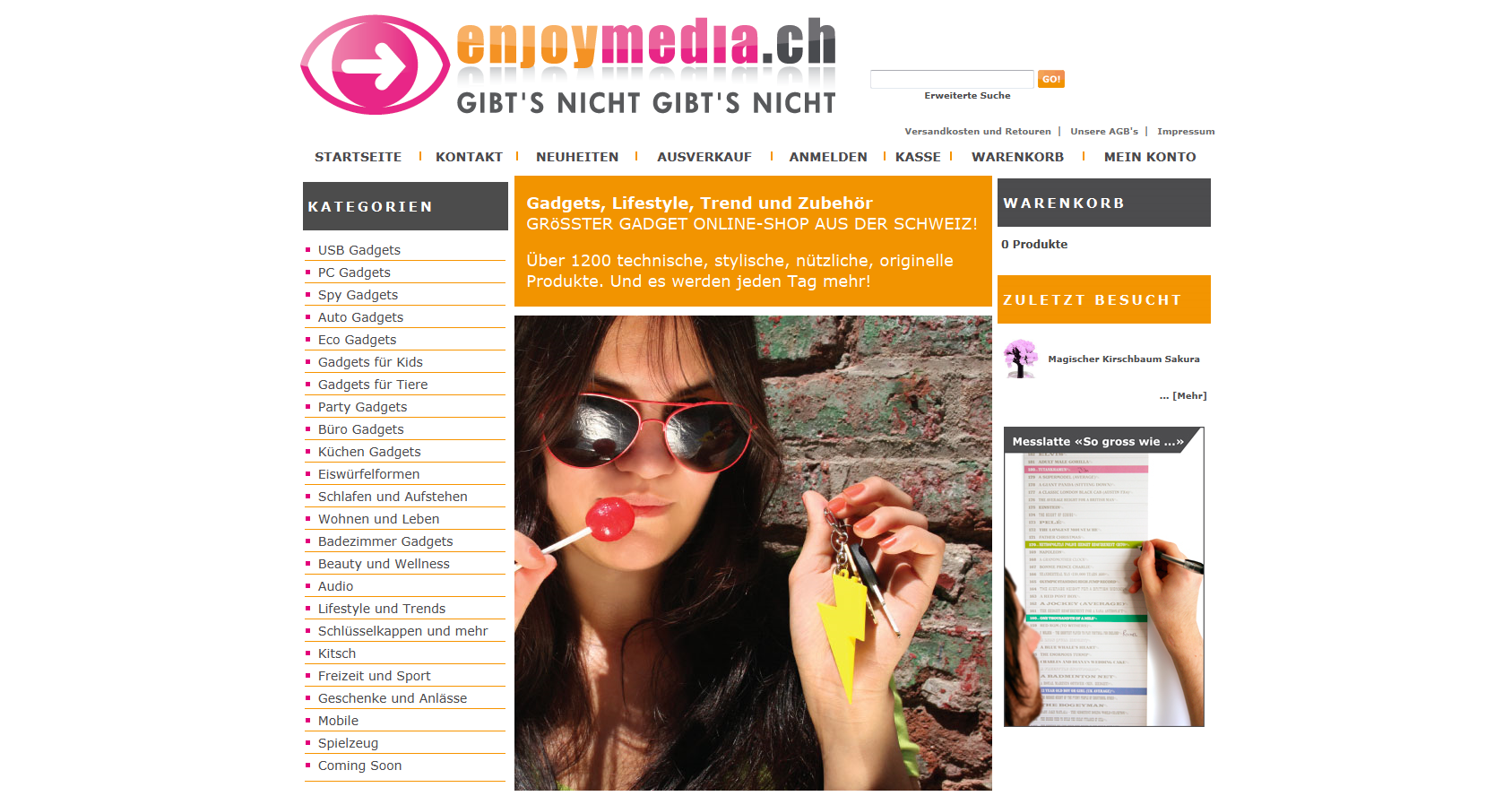 Enjoymedia.ch ist wie die Domain schon verrät, ein Gadget Shop aus der Schweiz, bzw. der größte Shop für Gadgets aus Europa. Hier wird dem User alles von USB-Gadgets wie einem USB-Duft-Öl-Zerstäuber bis hin zu Badezimmer Gadgets wie einem Zahnbürstenhalter in Affen-Form alles angeboten.