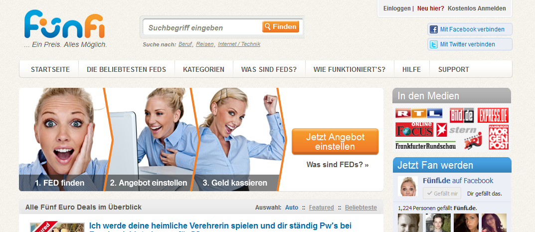 fünfi.de kann wohl guten Gewissens behaupten, rechtzeitig auf einen neuen Trend mit aufgesprungen zu sein. Auf fünfi.de kann jeder seine ganz eigene Dienstleistung anbieten. Und gleichzeitig besteht natürlich auch die Möglichkeit, jede beliebige Dienstleistung zu buchen. Der Clou: Jeder Service kostet nur 5,- €! Für 5,- € bekommt man so beispielsweise ein neues Logo für seine Website, eine heimliche Geliebte bei Facebook oder professionelle Übersetzungen ins Russische. Und wer kreativ oder besonders begabt ist, erstellt eigene FEDs (Angebote) und verdient fleißig mit.