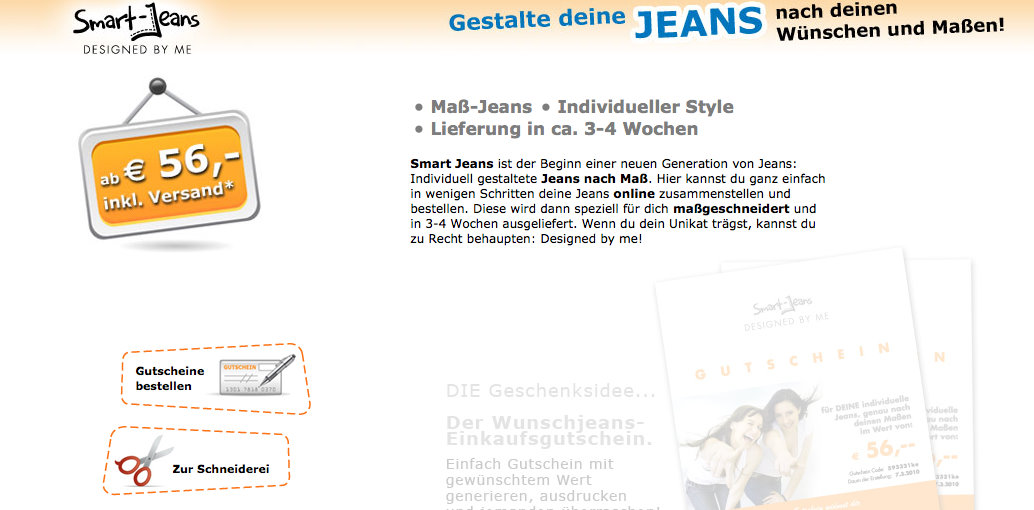 Ab 56 € bekommt man bei Smart Jeans eine Jeans, die nach den eigenen Angaben individuell geschneidert wird. Die Bestellung ist denkbar einfach: