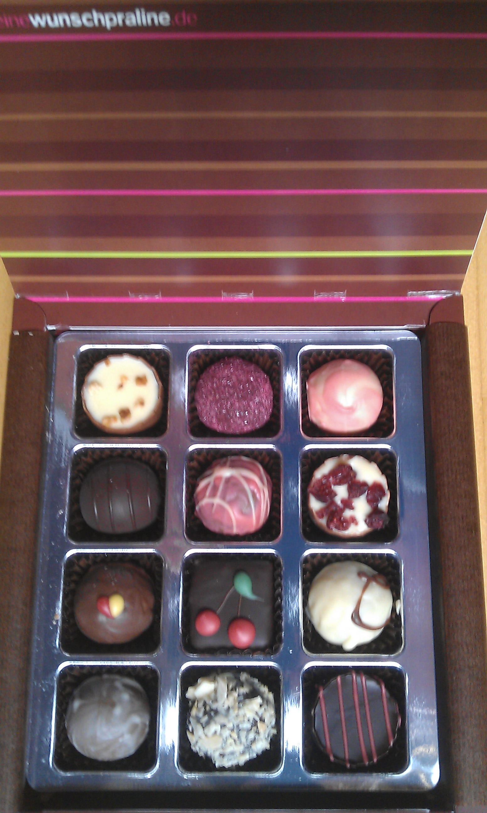 Insgesamt habst du damit über 400.000 verschiedene Möglichkeiten für deine persönliche Praline. Von deiner Zusammenstellung werden dann immer jeweils 12 Stück hergestellt. Der Preis dafür liegt dann je nach Ihren Wünschen bei ca. 16 Euro pro Packung.