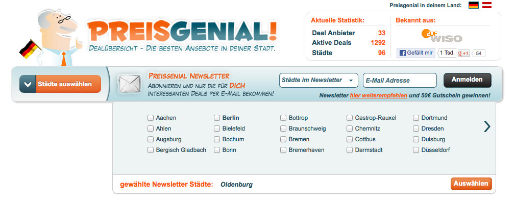 Ebenso interessant finde ich den personalisierten Newsletter. Dieser lässt sich auf den eigenen Wohnort (oder die nächstgelegene, größere Stadt) einstellen und liefert dann nur Deals aus der gewünschten Region. Was interessieren mich in Norddeutschland auch Deals aus Süddeutschland oder umgekehrt? Eben. Preisgenial.de listet momentan 34 verschiedene Deal-Anbieter. Neben den bekannten Anbietern wie QypeDeals, Groupon, Dailydeal und Co. sind auch kleinere Anbieter sowie speziellere Dienste dabei. Biodeals.de listet beispielsweise ausschließlich Bio-Deals, familydeal nur Deals für Familien.