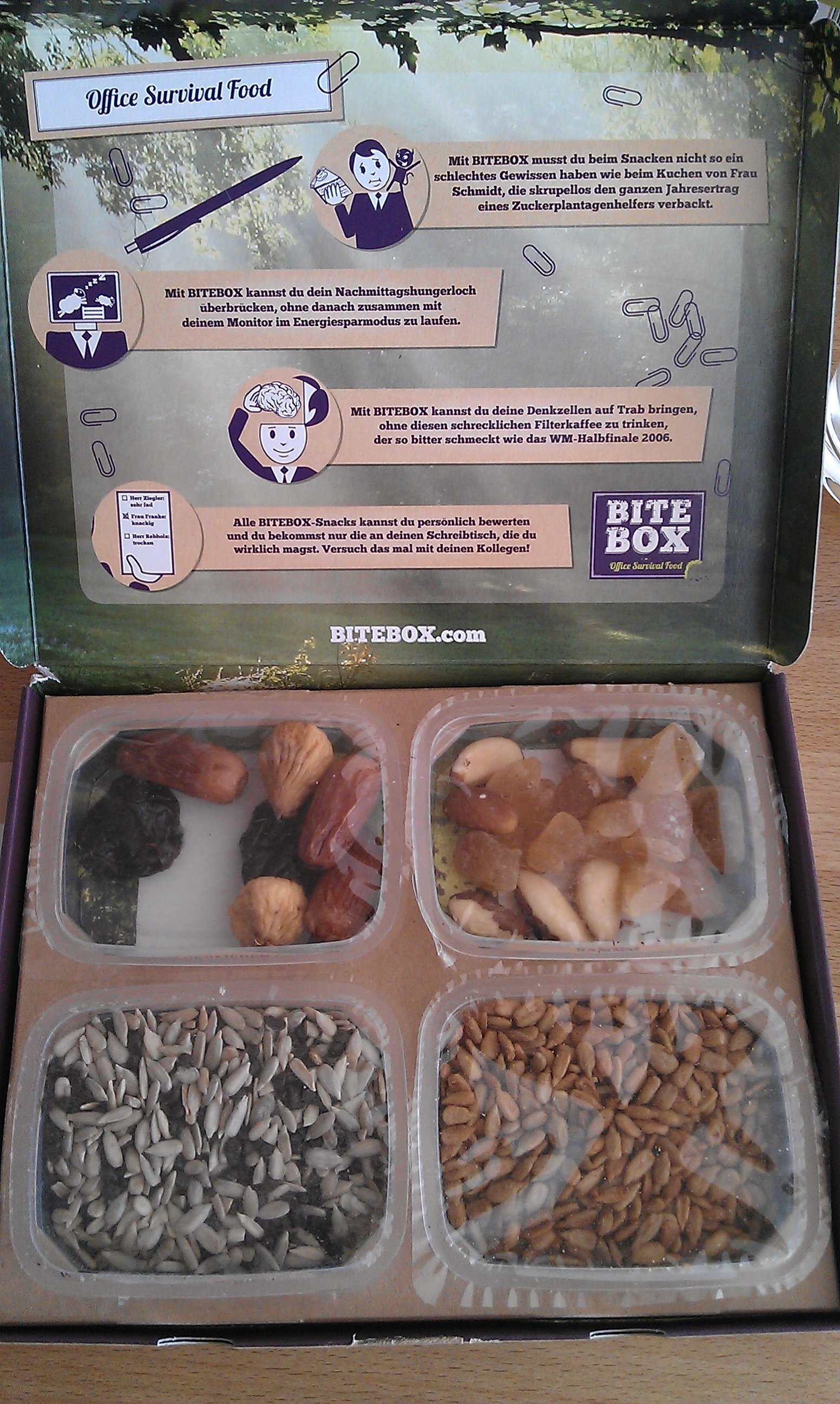 „Office Survival Food“. So nennen die Erfinder der BiteBox den Inhalt selbiger. In den Boxen befinden sich vier kleine Behälter, die mit verschiedenen Snacks gefüllt sind. Ihr könnt aus zig Nüssen, Körnern, Früchten und Beeren wählen um eure Lieblingsmixe zu finden. Jeder Mix hat einen passenden, witzigen Namen wie „Johannes B. Körner“, „Feiglinge“, „Du Pflaume“, „Holzfäller“, „Flotter Dreier“, „Nelson Mandelei“, „Punkt vor Strich“ und „Erdpierre“.