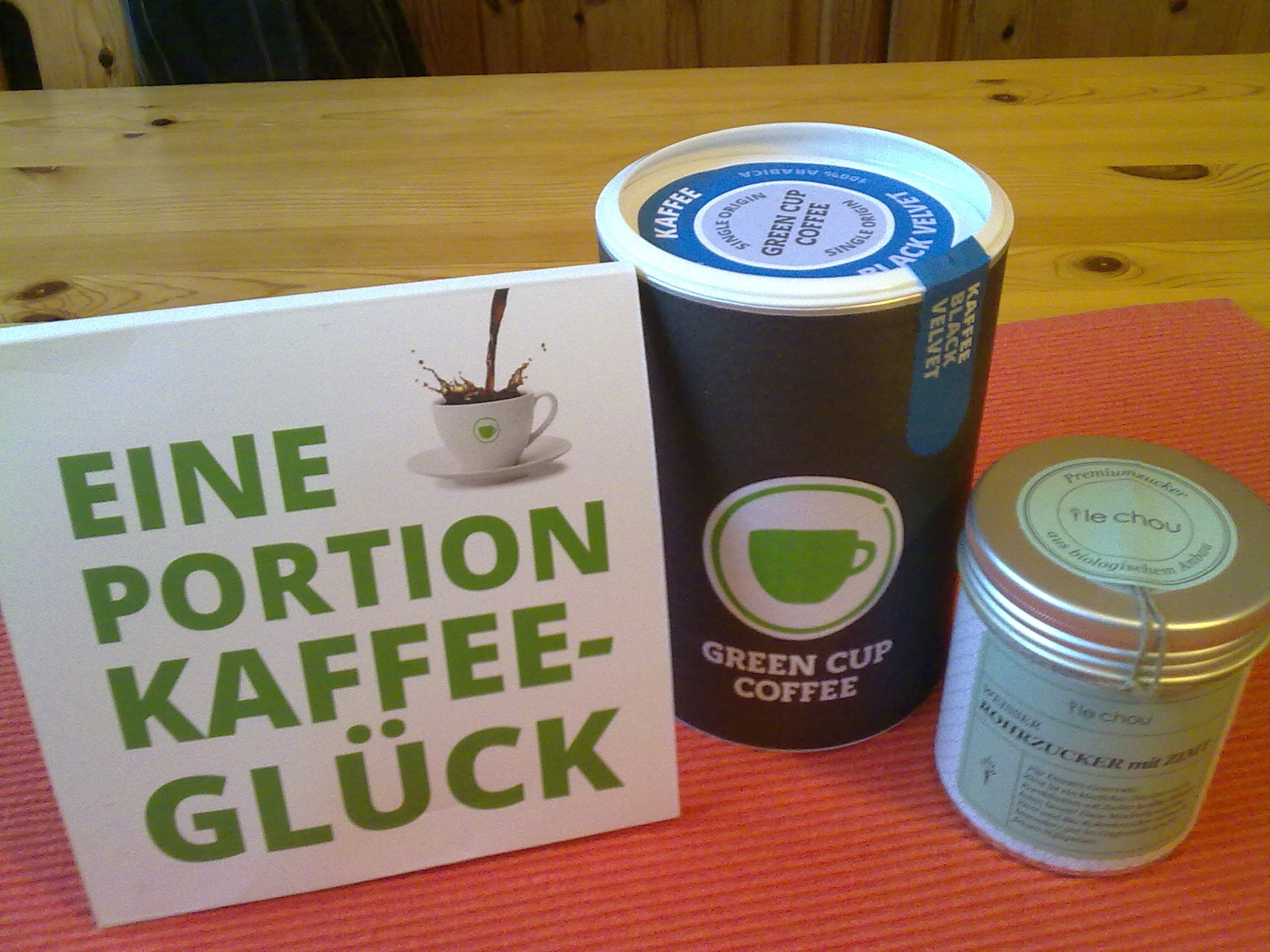 Green Cup Coffee hat mir unter anderem ein Döschen „weißer Rohrzucker mit Zimt“ geschickt: Leckerer Geschmack, gute Qualität, hübsche Verpackung – kam gut an.