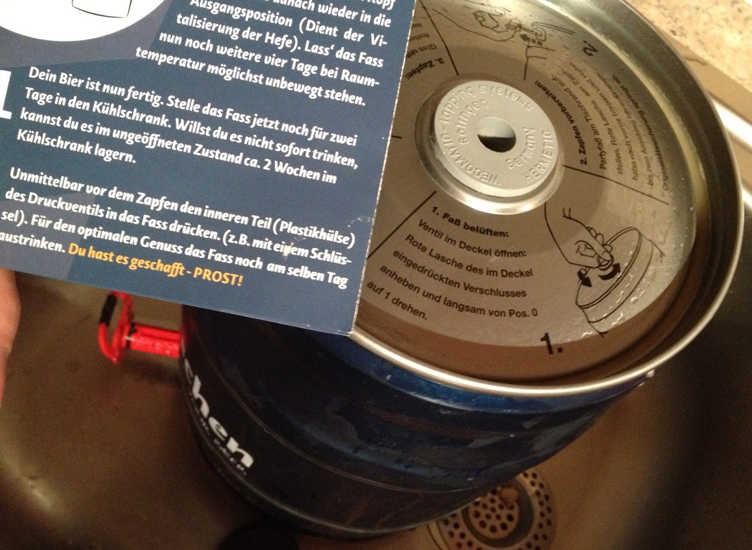 Dazu einfach den inneren teil des Druckventils in’s Fass drücken und mit dem Zapfhahn eure Gläser füllen – das war’s! Wie ihr seht ist es gar nicht so schwer das Bier selber zu brauen. Bei uns klappte es leider nicht so wie in der Anleitung angegeben. Auf dem Fass stand, dass man das Druckventil öffnen soll indem man die rote Lasche von 0 auf 1 dreht. Leider gibt es weder eine rote Lasche noch kann ich da irgendwas drehen. Also bin ich nach Anleitung gegangen.