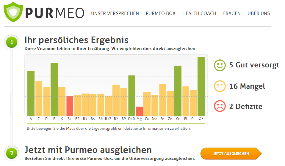 1. Die „Purmeo-Checkliste“ mit 20 Fragen zum Tagesbedarf und den Essgewohnheiten des Kunden ausfüllen und die eigenen Defizite analysieren lassen.