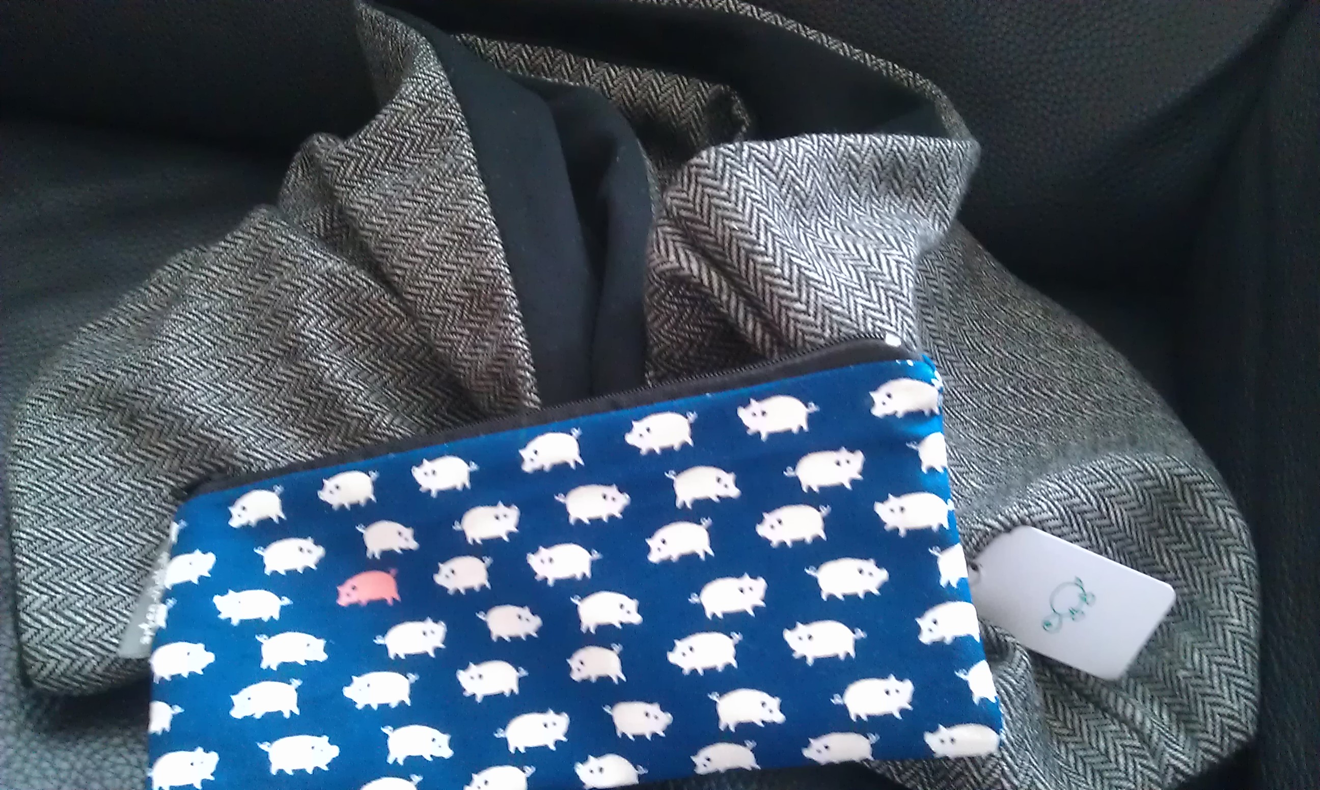 Aus dem gesamten Sortiment des Shops suchte ich mir zwei Artikel aus: einen Fischgrat-Schlauchschal und ein Schweinchen-Mäppchen: