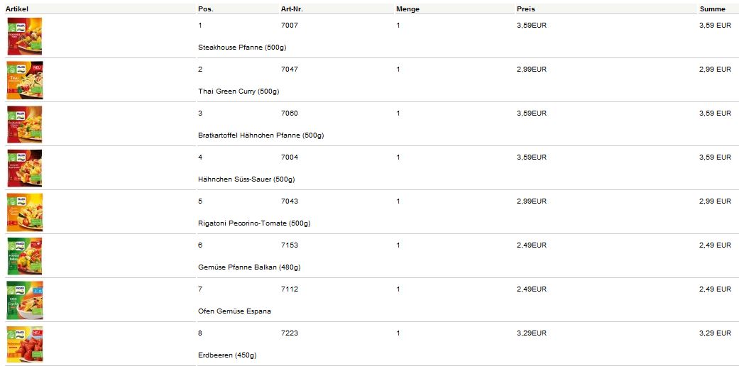 Es ist also kinderleicht sich im Onlineshop zurecht zu finden. Kommen wir nun zu meiner Bestellung. Von der Steakhouse Pfanne bis zu gefrorenen Erdbeeren habe ich ziemlich viel ausprobiert. Meine vollständige Bestellung habe ich euch hier einmal als Foto eingebunden.