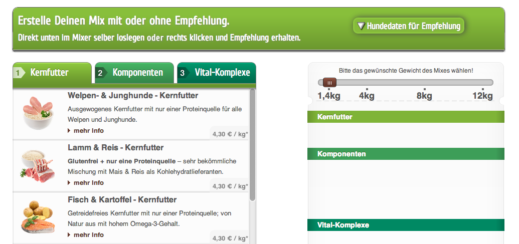 So habe ich für den My-Trend Test eine Futtermischung für Lotta (3 Jahre alt, Mischling, ca. 6 kg) bestellt. Der Futtermixer ist selbsterklärend und neben Hundefutter lässt sich auch Katzenfutter ganz einfach bestellen. Verschiedene Inhaltsstoffe und Grundfutter können kombiniert werden und mit Vital-Komplexen vermischt werden. So kann für jeden Hund das passende Futter zusammengestellt werden.