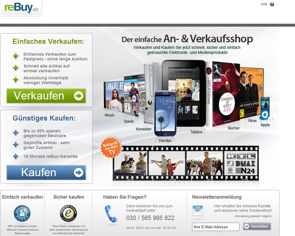 Einen guten Vergleich zu reBuy bieten Internet-Auktionshäuser wie zum Beispiel Ebay. Der Unterschied zwischen reBuy und Ebay ist der, dass bei reBuy keine langen Auktionen im Vordergrund stehen, sondern ein einfaches Verkaufen zum Festpreis. Die Abwicklung erfolgt innerhalb weniger Werktage und es lassen sich viele Artikel auf einmal verkaufen. So gehen zum Beispiel auch Elektrogeräte bei reBuy sehr gut weg.