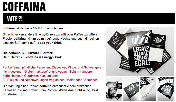 Koffein ist im Kaffee enthalten, in Energydrinks und in… naja, eben auch in Coffaina Pulver. Das Koffein-Pulver ersetzt sozusagen den klassischen Energydrink indem es sich mit allen möglichen Getränken mixen lässt und so ganz eigene Kreationen in Sachen Energydrink möglich macht. In kleinen Tütchen werden die 120mg Koffein vor allem an Kiosken in der deutschen Hauptstadt verkauft. Aber auch im Internet ist das Pulver erhältlich.